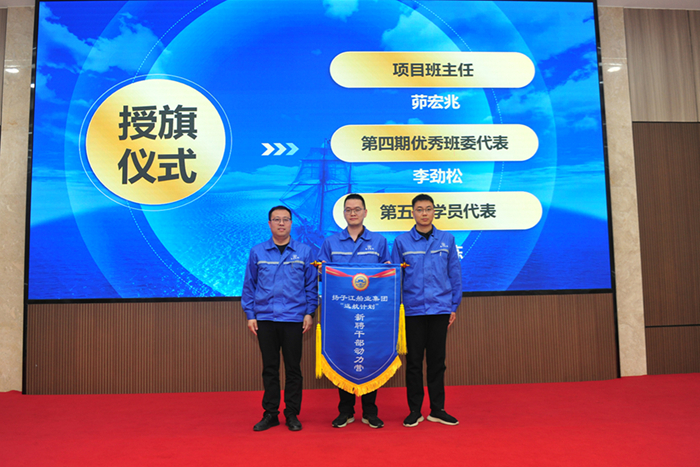 會(huì)上,茆宏兆副總將代表傳承的班旗交于第四期新聘干部優(yōu)秀班委李勁松,由李勁松將它傳承給第五期學(xué)員代表陳棟。