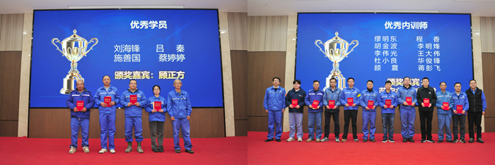 在結(jié)業(yè)儀式上,4名優(yōu)秀學(xué)員代表分別結(jié)合自身參與的《揚子江造船解決方案》(YSS 2.0)、電子化廠圖等課題,分享了數(shù)字化轉(zhuǎn)型實踐中的經(jīng)驗與感悟。2025年集團內(nèi)訓(xùn)師全年授課量達732課時,培訓(xùn)人次超2.5萬,其中安環(huán)條線人均授課17課時,生產(chǎn)條線人均14課時,展現(xiàn)了內(nèi)訓(xùn)師團隊的強大賦能能力。現(xiàn)場表彰了4名“智改數(shù)轉(zhuǎn)專項優(yōu)秀學(xué)員”和10名“優(yōu)秀內(nèi)訓(xùn)師”,公司領(lǐng)導(dǎo)為獲獎?wù)哳C發(fā)證書及獎金。
