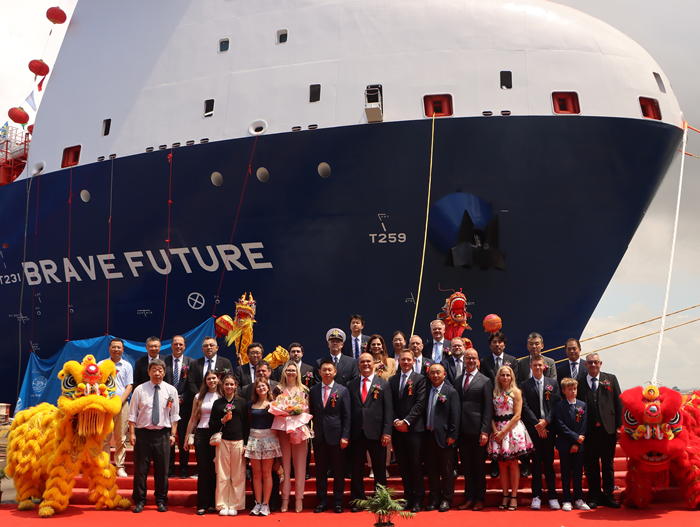 揚(yáng)子三井代表宋書(shū)明先生表示:“繼今年1月“Brilliant Future”號(hào)成功交付后,我們迎來(lái)了第二艘雙燃料LEG運(yùn)輸船的交付。值此機(jī)會(huì),我們衷心感謝Braskem的Cristiane女士、Hardi先生,以及Ocean Yield的Andreas先生。感謝Hartmann集團(tuán)的Hartmann博士、Adami船長(zhǎng)、Ionut Cornea先生、龍葉飛先生,感謝AC-INOX的Sascha先生。感謝整個(gè)Hartmann團(tuán)隊(duì)始終如一的支持,也感謝DNV船級(jí)的專業(yè)指導(dǎo)。同時(shí),向所有參與本船建造的YAMIC員工致以誠(chéng)摯謝意。未來(lái),我們將繼續(xù)與各方緊密合作,為船東研發(fā)建造更加安全、更加綠色、更高性能的綠色能源氣體運(yùn)輸船產(chǎn)品。”教母Cristiane Rego女士為新船命名并擲香檳禮,現(xiàn)場(chǎng)鞭炮齊鳴、禮花綻放,汽笛共鳴,龍獅共舞,祝福新船和船員航行平安,勇敢前行,為船東和租家?guī)?lái)好運(yùn)與財(cái)富,也為Hartmann、DNV和揚(yáng)子三井贏得榮耀,帶給所有人勇氣與希望。Hartmann代表Adami Ulrich表示:“衷心感謝揚(yáng)子三井團(tuán)隊(duì)。揚(yáng)子三井憑借嚴(yán)謹(jǐn)?shù)墓芾砗椭苊艿挠?jì)劃,確保了本船的順利交付。我們對(duì)揚(yáng)子三井未來(lái)的發(fā)展充滿信心,也感謝所有為此付出努力的員工?!?/span>Braskem代表Hardi Schuck表示:“正是由于揚(yáng)子三井在船舶建造過(guò)程中的專業(yè)精神與奉獻(xiàn),讓我們對(duì)Brave Future感到無(wú)比自豪。”