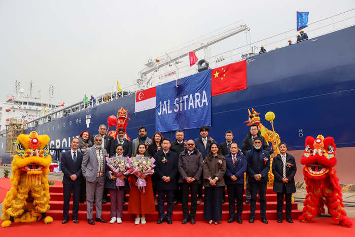 1月6日,揚子三井為該船舉行了隆重的命名儀式。教母Shraddha Karnati女士,命名贊助人鈕文玨女士, JALDHI執(zhí)行董事V.C. Bothra先生、CEO Suresh Kumar先生,勞氏船級社大中華區(qū)外國船東商務經理Dimitrios Chalas先生,我集團副總經理兼揚子三井總經理宋書明先生以及各合作方代表、員工等代表參加了命名儀式。教母Shraddha Karnati女士命名該船為“JAL SITARA”輪,隨后命名贊助人鈕文玨女士為新船砍纜、擲香檳禮。鞭炮、禮花齊響,汽笛共鳴。祝福新船和船員航行平安,為船東帶來好運與財富,為勞氏船級社和揚子三井贏得榮譽。