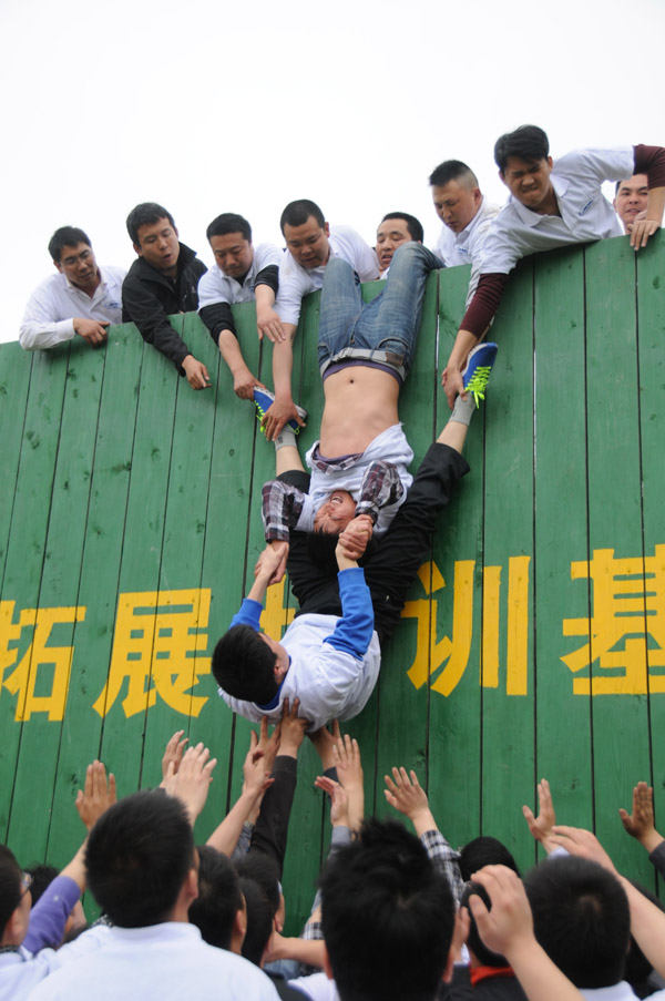 下午的拓展項目更是“體驗升級”,“卓越圈”項目讓人意識到從優(yōu)秀到卓越不是一蹴而就的,是一個曲折的過程,是一個不斷超越的過程,在一輪一輪挑戰(zhàn)5.4秒這個終極時限的過程中,我們的年輕干部們磨傷了手、劃傷了臉、蹲酸了腿,任灰塵在身邊沸騰,任汗水在臉上流淌,他們都沒有退縮一步,不斷的嘗試、改進、再嘗試、再改進,最終,5.21秒這個卓越的成績被記錄在了成績冊上,大家歡呼雀躍。到了最后的挑戰(zhàn)了,“畢業(yè)墻”垂直立于地面,沒有輔助設(shè)施,沒有輔助人員,大伙兒覺得需要1.5小時這47名學(xué)員才能全部翻過這面墻——4.2米高的墻。按照教練的指導(dǎo),做基礎(chǔ)的、做輔助的、做保護的、做拉手的,自發(fā)輪流上陣,伙伴們一個一個互相拉扯著翻越了畢業(yè)墻,他們中有人肩膀被踩破了,有的肌肉僵硬了,有的手臂勒紫了,但都沒有吭一聲,只想著讓所有的伙伴全都快速翻過墻,堅持不懈的精神在他們中不斷傳遞著……終于他們創(chuàng)造了一個自己都沒敢想的奇跡,15分49秒51,所有47人全部完成了翻越!