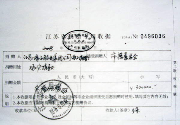 2008年5月,集團(tuán)公司向四川汶川災(zāi)區(qū)捐建學(xué)校計(jì)1000萬元,集團(tuán)員工向四川災(zāi)區(qū)捐款30萬元人民幣。(附1000萬捐款憑證及員工捐款30萬憑證)