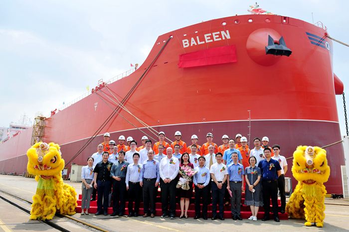 The sponsor Ms. Guan Yu named the new ship "baleen" and threw champagne. Ms. Guan Yu said that as a senior employee of KLAVENESS company, naming the new ship is not only an honor but also a responsibility. She hopes that the new generation of cleanbu series ships will bring more efficient and economic services to the company and its customers.