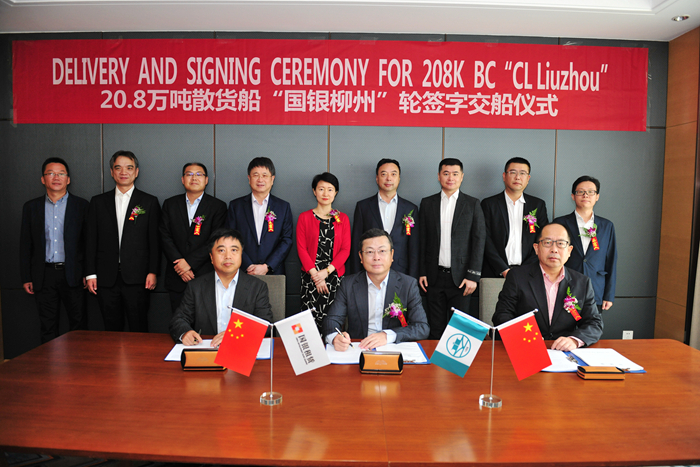 ▲On the same day, in the common witness of representatives from all parties, Mr. Xiong Jianfeng, General Manager of China Bank Financial Leasing Ship Business Department, Mr. Du Chengzhong and Mr. Zhang Tao, Deputy General Manager of our group signed the delivery documents on behalf of each parties respectively. The ship "LIUZHOU" (National Bank of Liuzhou) was successfully delivered.
