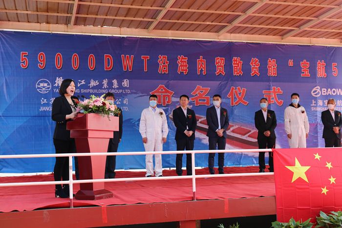 At 8:58a.m. of April 8, Godmother Chen Zhaodi, Mr Qin Rongyu, Technical Manager, Mr. Dong Bin, Machinery Director at ship technology department of Baosteel shipping, Mr. Ma Tianyi,surveyor of China Classification Society, Mr. Kong Zheng, Director of shipSupervision Department of Shanghai Shuangxi Maritime Development Co., Ltd. with site team, Mr. Song Shuming, Deputy General Manager of our Group and othercompany leaders attended the christening ceremony. Godmother Chen Zhaodi christened the new ship by cutting the line praying for its maiden voyage. “BAOHANG56” is the first ship built by our group for Shanghai Baosteel Shipping Co.,Ltd. During the construction process, the shipowner, classification society,supervision team and shipyard worked together to overcome difficulties such aspower restriction and COVID-19, and completed the constructionof the ship with high quality in only 9 months, which fully reflects YZJ speed.